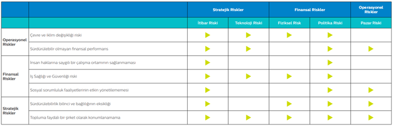 Grubumuzun karşılaştığı riskleri, her yıl düzenli olarak gerçekleştirdiğimiz Risk Tespit ve Değerlendirme görüşmeleriyle belirliyoruz. Tespit ettiğimiz riskleri, üç ana kategori altında sınıflandırıyoruz: Finansal, Stratejik ve Operasyonel Riskler.
