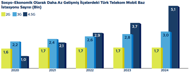 Türk Telekom olarak, Türkiye’nin dört bir yanında dijital kapsayıcılığı artırma misyonumuzla yatırımlarımıza devam ediyoruz. Mobil pazarın güçlü oyuncularından biri olarak, yalnızca büyük şehirlerde değil, sosyoekonomik olarak daha az gelişmiş ilçelerde de kapsama alanımızı genişletiyor, böylece dijital uçurumu azaltma hedefimize katkıda bulunuyoruz. 2020’de %76 olan bu bölgelerdeki nüfus kapsama oranımızı, 2024 yılı itibarıyla %99’a çıkararak, sosyal yatırımlarımıza olan bağlılığımızı bir kez daha ortaya koyduk.