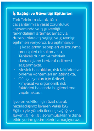 Türk Telekom olarak, iş sağlığı ve güvenliği (İSG) yönetim sistemimizi tüm çalışanlarımızı ve operasyonlarımızı kapsayacak şekilde uyguluyoruz. İSG Risk Değerlendirme Prosedürümüz kapsamında, lokasyon ve faaliyet bazlı tehlike tanımlama ve risk değerlendirme çalışmaları yürütüyor, yüksek riskli alanlar için önleyici aksiyonlar alıyoruz.